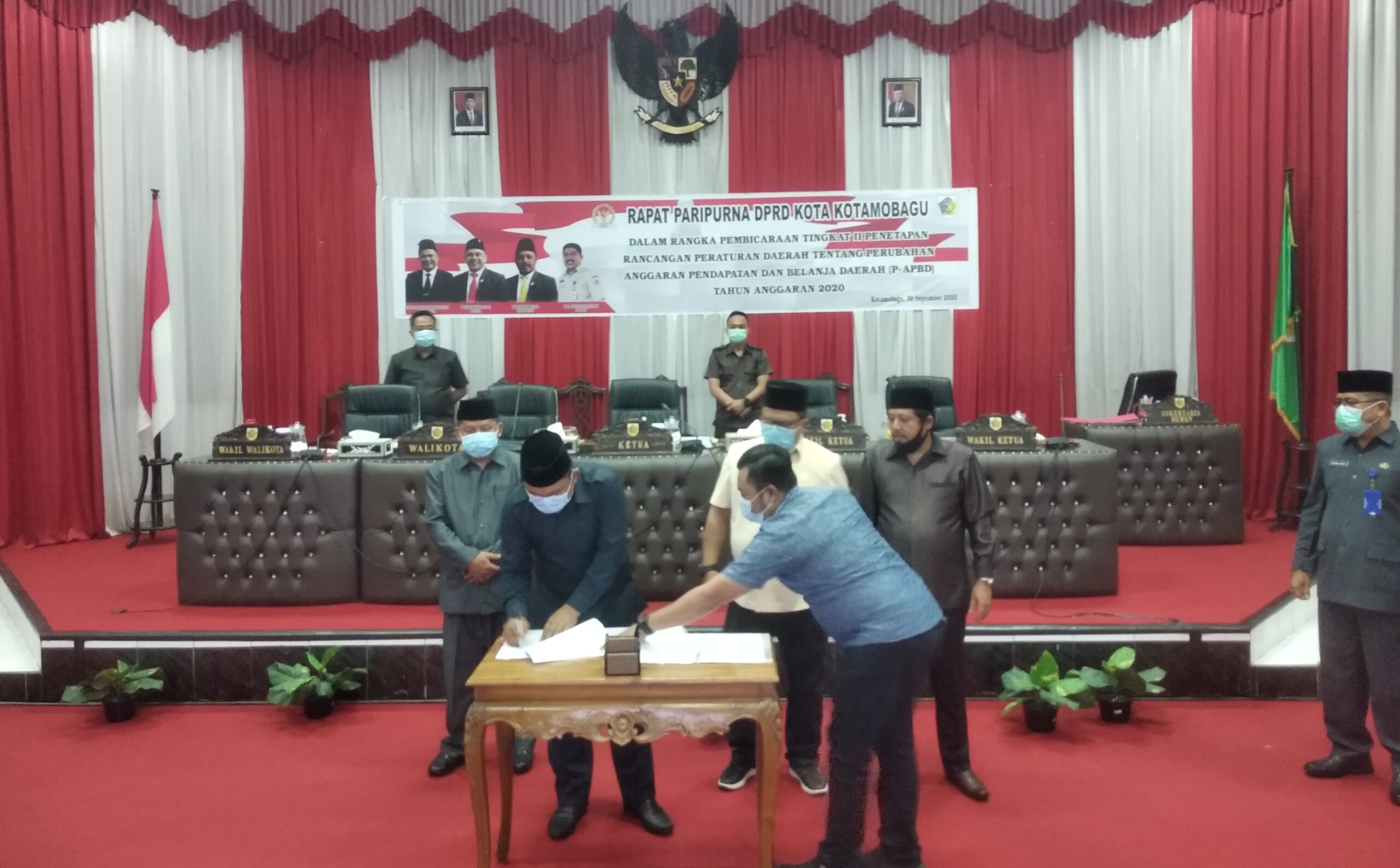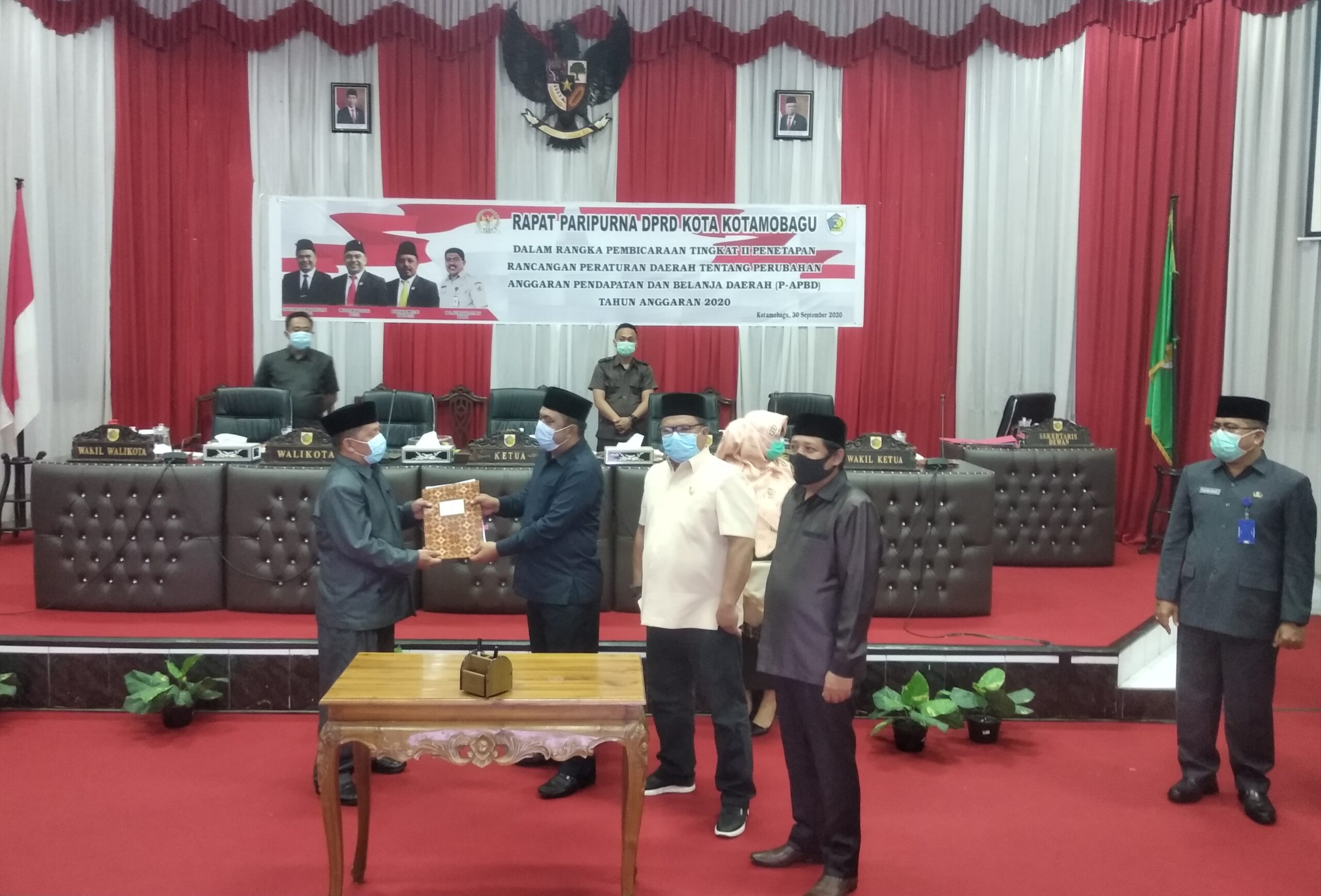 Sebelum rapat paripurna ditutup, pimpinan DPRD Kotamobagu menyerahkan draf Ranperda P-APBD Tahun 2020, kepada Pemkot Kotamobagu melalui Wakil Wali Kota, Nayodo Koerniawan.