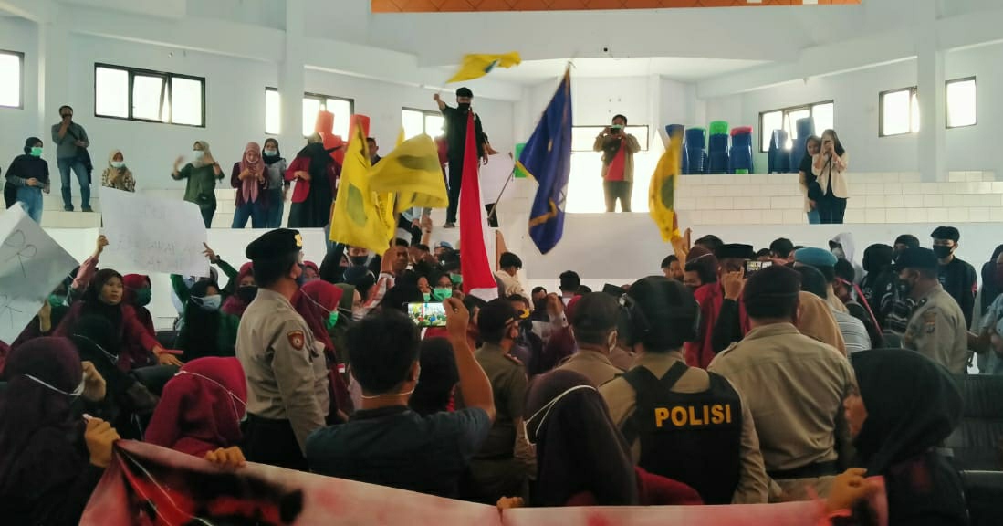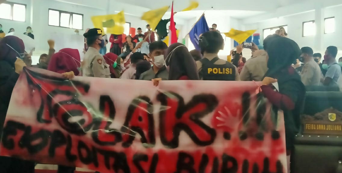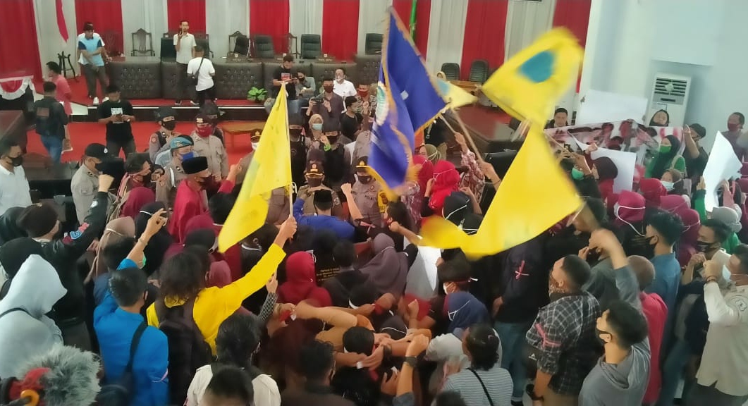 Mahasiswa melakukan demo di dalam kantor DPRD Kotamobagu. (Foto: Tangkapan Layar)