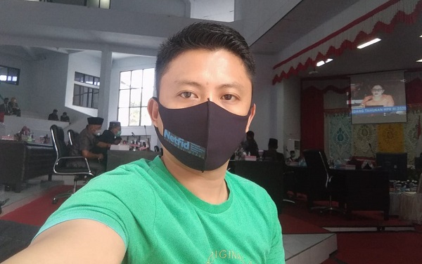 Setiap melaksanakan tugas jurnalis, Gito Ardianto Simbala, selalu mengunakan masker sebagai rutinitasnya meliput berita guna mengantisipasi Virus Covid-19.