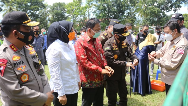 mediatotabuan.co, Kotamobagu – Kapolda Sulut Irjen Pol Panca Putra Simanjuntak, Sekprov Sulut Edwin Silangen, Wali Kota Kotamobagu Ir Hj tatong Bara, serta Forum Kordinasi Pimpinan Daerah (Forkopimda) Sulut maupun Kota Kotamobagu, meninjau simulasi pemungutan suara Pemilihan Gubernur dan Wakil Gubernur (Pilgub) tahun 2020, di Lapangan Arruman Jaya, Kelurahan Motoboi Kecil.