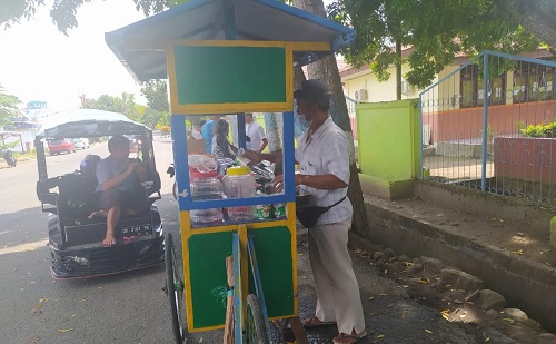 mediatotabuan.co, Kotamobagu – Senyumannya hilang dalam balutan masker berwarna hijau, kemeja putih kotak-kotak menemaninya di hari itu, tapi suara sapa dan tawa terdengar tak asing bagi pelanggan setianya, itulah mas Wawan sapaan akrabnya saat ditemui di depan Madrasah Tsanawiyah (MTs) Negeri 2 Kotamobagu.