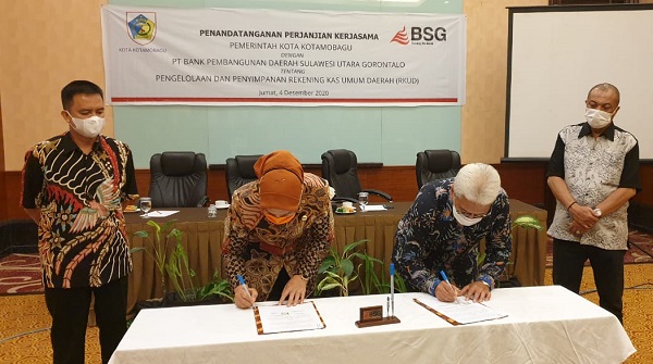 Penandatangan MoU ini, dilakukan oleh Wali Kota Kotamobagu, Ir Hj Tatong Bara dan Direktur Utama (Dirut) BSG, Jefry A M Dendeng, sedangkan untuk PKS dilakukan Kepala Badan Pengelola Keuangan Daerah (BPKD) Kotamobagu, Sugiarto Yunus, dan Pimpinan Cabang (Pincab) BSG Kotamobagu, Jummy Roboth dan disaksikan Sekot Kotamobagu, Ir Sande Dodo MT dan jajaran BSG.