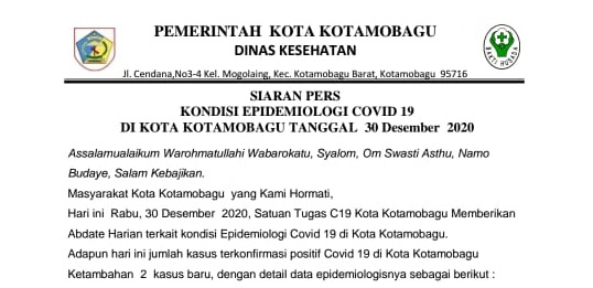 Begitu juga di Kota Kotamobagu, akhir – akhir ini, pasien terkonfirmasi positif Covid-19, terus meningkat, bahkan sebagaimana data yang diterima mediatotabuan.co terkait update Covid-19 di Kotamobagu sebagaimana siaran pers dari Tim Satgas Covid-19 Kotamobagu per tanggal 30 Desember 2020, ketambahan dua orang pasien terkonfirmasi positif Covid-19.