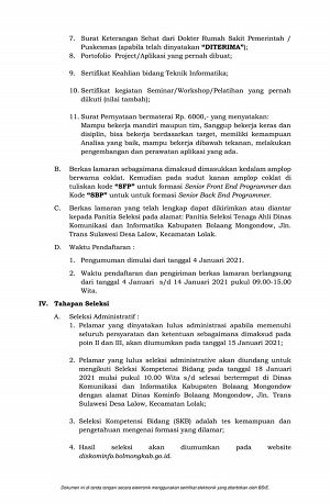 Sekretaris Diskominfo Bolmong Jenli Mongilong, S.Kom, mengatakan, persyaratan bagi pelamar yang di butuhkan untuk tenaga programer yakni pria dan wanita berusia maksimal 35 tahun, dan memiliki sertifikat keahlian bidang teknik informatika.