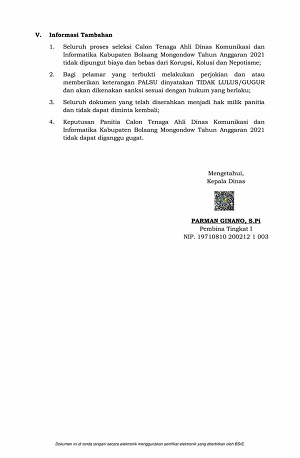 Dia juga menjelaskan, seleksi ini berdasarkan pengumuman Nomor : 800/D.19/KOMINFO/13/1/2021 tentang Seleksi Penerimaan Tenaga Ahli/Kontrak,  ditandatangani langsung Kepala Diskominfo Kabupaten Bolmong, Parman Ginano, S.Pi.