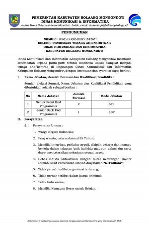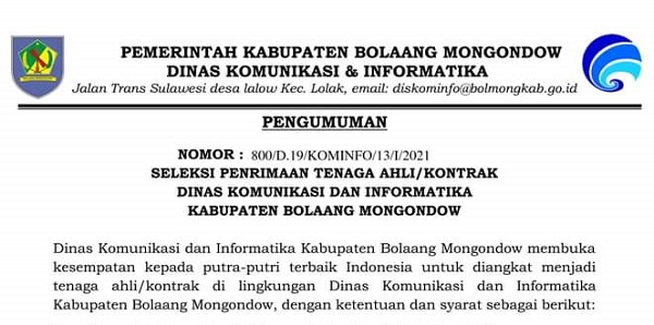 mediatotabuan.co, Bolmong – Dinas Komunikasi dan Informatika (Diskominfo), kabupaten Bolaang Mongondow (Bolmong), mengugumkan seleksi tenaga ahli dengan status tenaga kontrak.