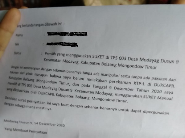 mediatotabuan.co, Boltim – Diduga ada oknum yang mengaku sebagai pegawai honorer di Dinas Kependudukan dan Catatan Sipil (Dukcapil) Bolaang Mongondow Timur (Boltim), “gentayangan” membawa surat pernyataan untuk ditanda tanggani pemilih penguna Surat Keterangan (Suket), pada Pilkada Boltim, 9 Desember 2020 lalu.