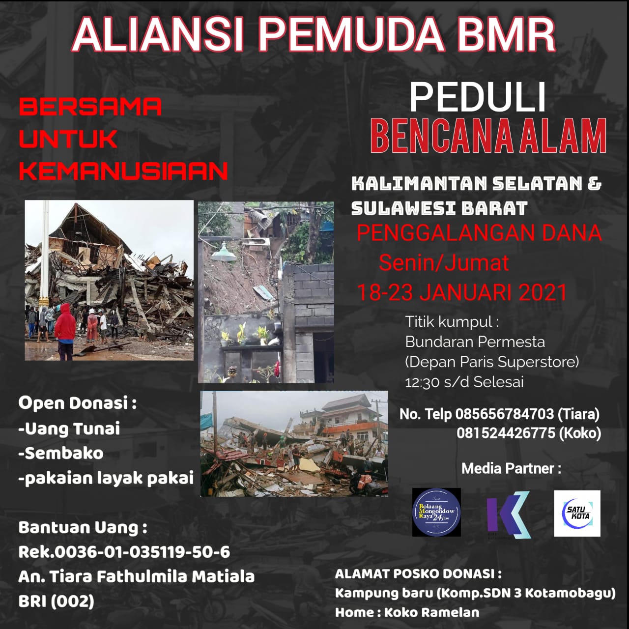 Ia juga mengungkapkan, aliansi pemuda BMR saat ini membuka posko donasi bantuan di Sekretariat, tepatnya di kampus UDK A, adapun yang nantinya ingin memberikan sedikit rezekinya berupa uang, langsung  bisa di nomor rekening – 0036-01-035119-50-6 – An. Tiara Fathulmila Matiala.
