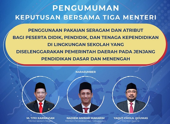 SKB tiga menteri ini yakni Menteri Pendidikan Nadiem Makarim, Menteri Agama Yaqut Cholil Qoumas dan Menteri Dalam Negeri Tito Karnavian.