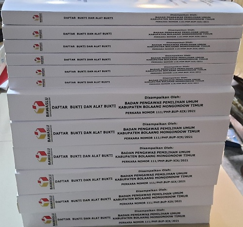 “Iya, hari ini (Senin), pemasukan keterangan dan alat bukti Bawaslu Kabupaten Bolaang Mongondow Timur, soal perselisihan hasil Pemilihan Bupati dan Wakil Bupati Bolaang Mongondow Timur 2020 pada Perkara Konstitusi Nomor : 111/PHP.BUP-XIX/2021 dan 119/PHP.BUP-XIX/2021,” akunya.