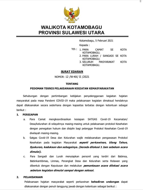 Pedoman ini berdasarkan Edaran Walikota Nomor 12/W-KK/II/2021, tertanggal 5 Februari 2021, yang ditandatangani Wali Kota Kotamobagu, Ir Hj Tatong Bara ini, ditujukan kepada seluruh Camat, Lurah dan Sangadi serta masyarakat Kota Kotamobagu.