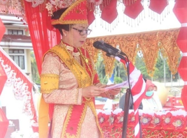 Bertindak Inspektur upacara Bupati Bolmong, Dra Hj Yasti Soepredjo Mokoagow, dalam sambutan menyampaikan ucapan selamat HUT Kabupaten Bolmong ke – 67 tahun.