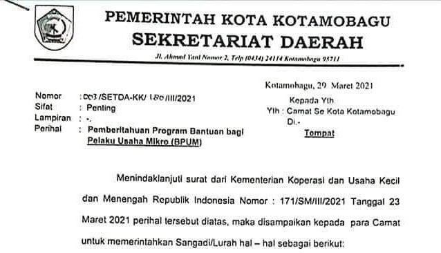Hal tersebut menyusul adanya surat dari Pemkot Kotamobagu ke seluruh Camat untuk mensosialiasikan adanya program ini sebagai tindak lanjut atas surat dari KemenkopUKM, nomor 171/SM/III/2021 tanggal 23 Maret 2021.