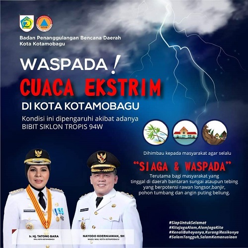 mediatotabuan.co, Kotamobagu – Pemerintah Kota (Pemkot) Kotamobagu, dipimpin Wali Kota Ir Hj Tatong Bara dan Wakil Wali Kota Nayodo Koerniawan SH, meminta warganya untuk mewaspadai cuaca ekstrim yang bakal terjadi.