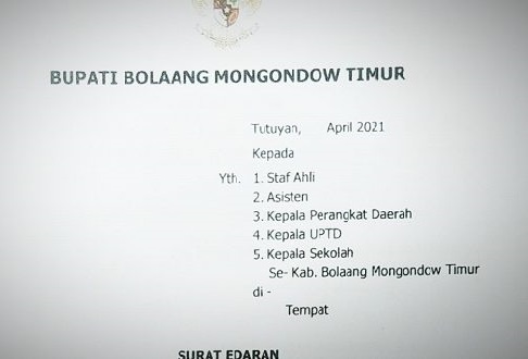 Hal ini tertuang dalam surat edaran Bupati Boltim Nomor B.03/BMT/79/V/2021, sebagai tindak lanjut surat edaran MenpanRB Nomor 8 Tahun 2021, tentang pembatasan kegiatan bepergian ke luar daerah atau mudik serta cuti bagi ASN dalam masa pandemi Covid-19.