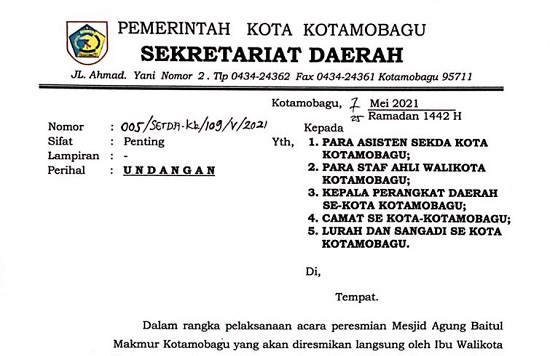 “Dalam rangka pelaksanaan acara peresmian Masjid Agung Baitul Makmur Kotamobagu, yang akan dirasmikan langsung oleh ibu Wali Kota Kotamobagu, dengan ini mengundang bapak ibu untuk hadir pada kegiatan yang dimaksud,” kutipan isi undangan tersebut.