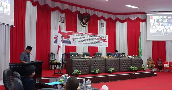 Paripurna dalam rangka pembicaraan tingkat satu penyampaian Rancangan Peraturan Daerah (Ranperda) tentang pertanggung jawaban pelaksanaan Anggaran Pendapatan dan Belanja Daerah (APBD) Kota Kotamobagu tahun anggaran 2020 ini, dipimpin Wakil Ketua Dewan Syarifudin Mokodongan, didampingi Herdy Korompot dan dihadiri anggota DPRD Kotamobagu, Forkopimda, Sekretaris Daerah, para asisten, pejabat eselon II dan III, staf ahli, camat, lurah dan sangadi se- Kota Kotamobagu.