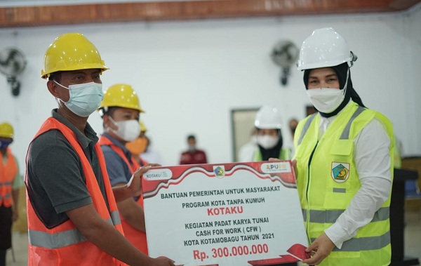 mediatotabuan.co, Kotamobagu – Wali Kota Kotamobagu, Ir Hj Tatong Bara, meluncurkan Program Padat Karya Tunai atau Cash For Work (CFW) dari program Kota Tanpa Kumuh (Kotaku) di tahun 2021, Rabu (9/06).