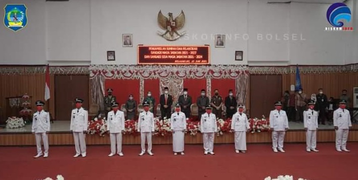 mediatotabuan.co, Bolsel – Bupati Bolaang Mongondow Selatan (Bolsel), Iskandar Kamaru, didampingi Wakil Bupati, Deddy Abdul Hamid, melantik 28 sangadi atau kepala Desa, hasil Pemilihan Sangadi (Pilsang), serentak tahun 2021, Kamis (10/06), di Gedung DPRD Bolsel.