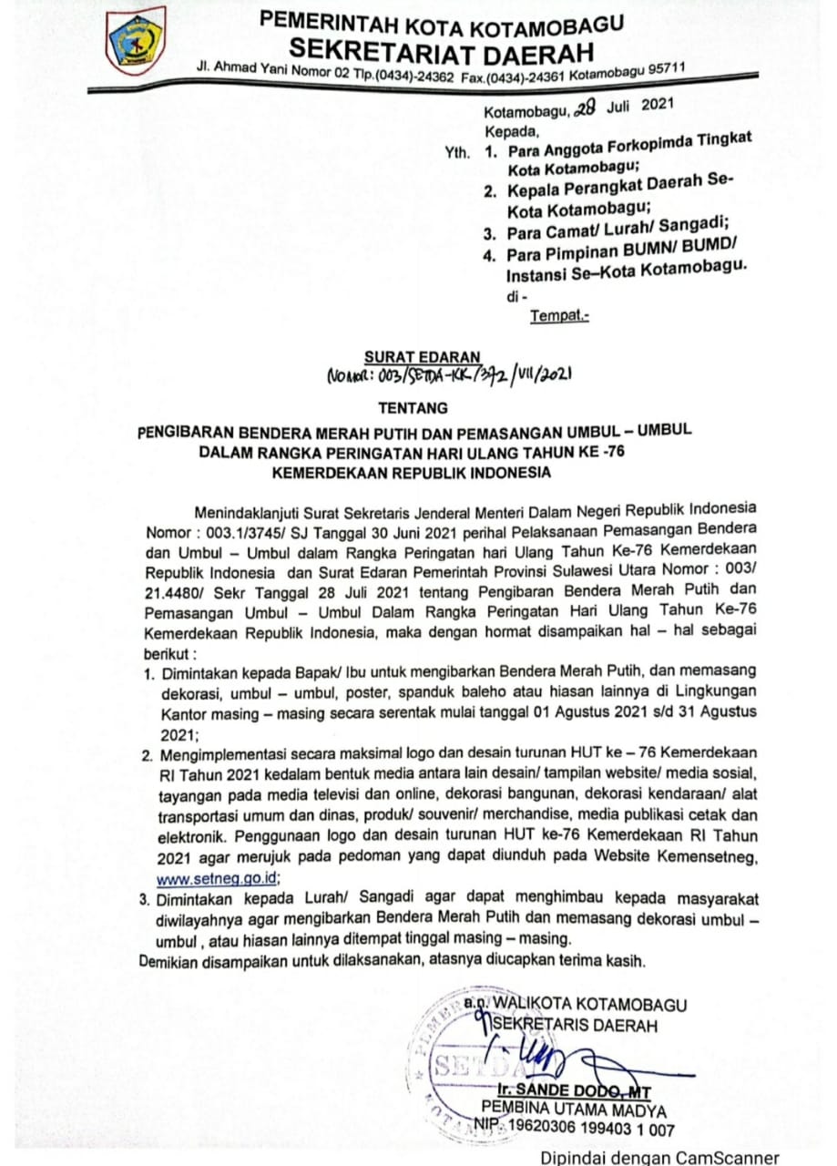 Surat yang ditandatangani oleh Sekretaris Daerah (Sekda) Kotamobagu, Ir Sande Dodo MT tersebut terdapat tiga poin dan salah satunya meminta kepada lurah dan sangadi agar dapat menghimbau kepada masyarakat diwilayahnya agar mengibarkan Bendera Merah Putih dan memasang dekorasi umbul-umbul , atau hiasan lainnya ditempat tinggal masing- masing.