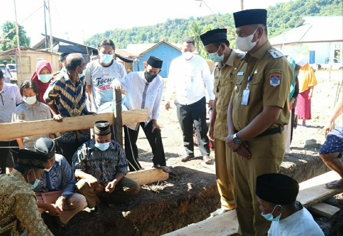 Kegiatan ini, menerapkan Protokol Kesehatan (Prokes) Covid-19 dengan ketat. Nampak mantan Sekretaris Daerah (Sekda) Boltim ini, mengunakan masker saat meletakan batu pertama pembangunan masjid.