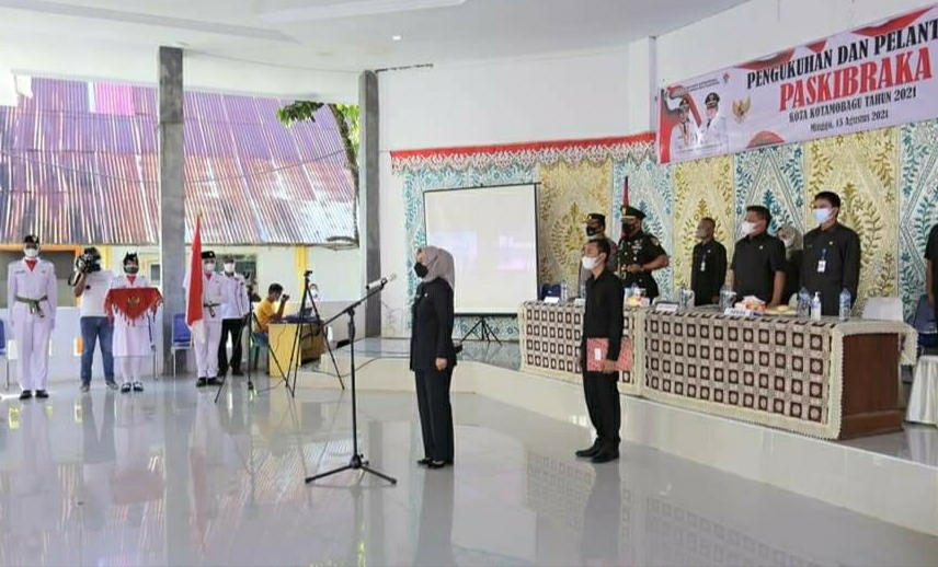 mediatotabuan.co, Kotamobagu – Wali Kota Kotamobagu, Ir Hj Tatong Bara, mengukuhkan Paskibraka dan Duta Pancasila Kota Kotamobagu Tahun 2021, Minggu (15/08).