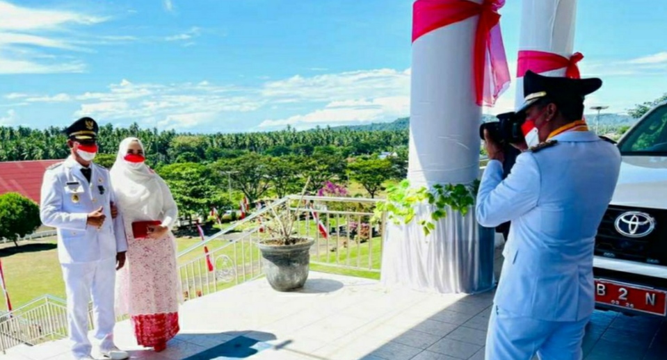 Bupati yang menggunakan seragam lengkap PDU terlihat memegang kamera sambil mengatur posisi berdiri Wabup Oskar Manoppo dan istrinya.