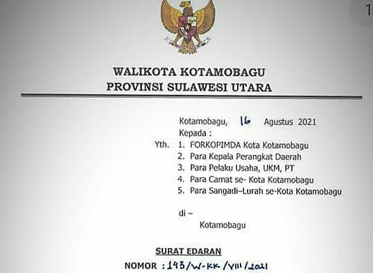 Surat edaran yang ditanda tangani Wali Kota Kotamobagu Ir. Hj. Tatong Bara, menekankan tentang penerapan Protokol Kesehatan (Prokes) Covid-19 ketat.