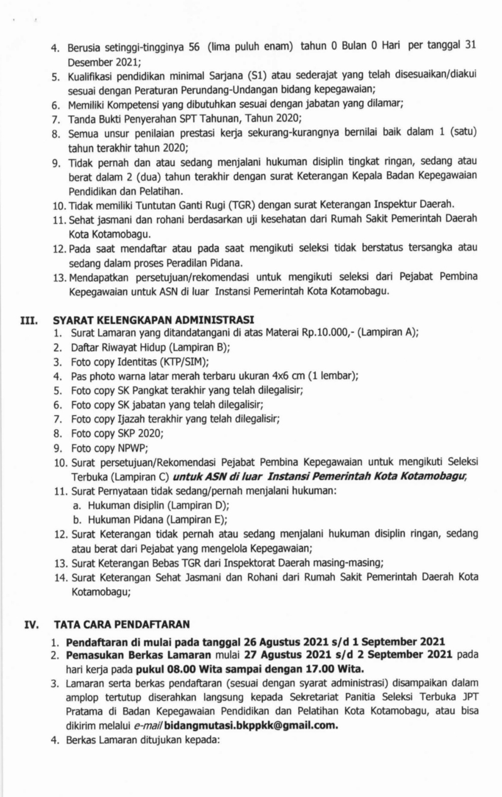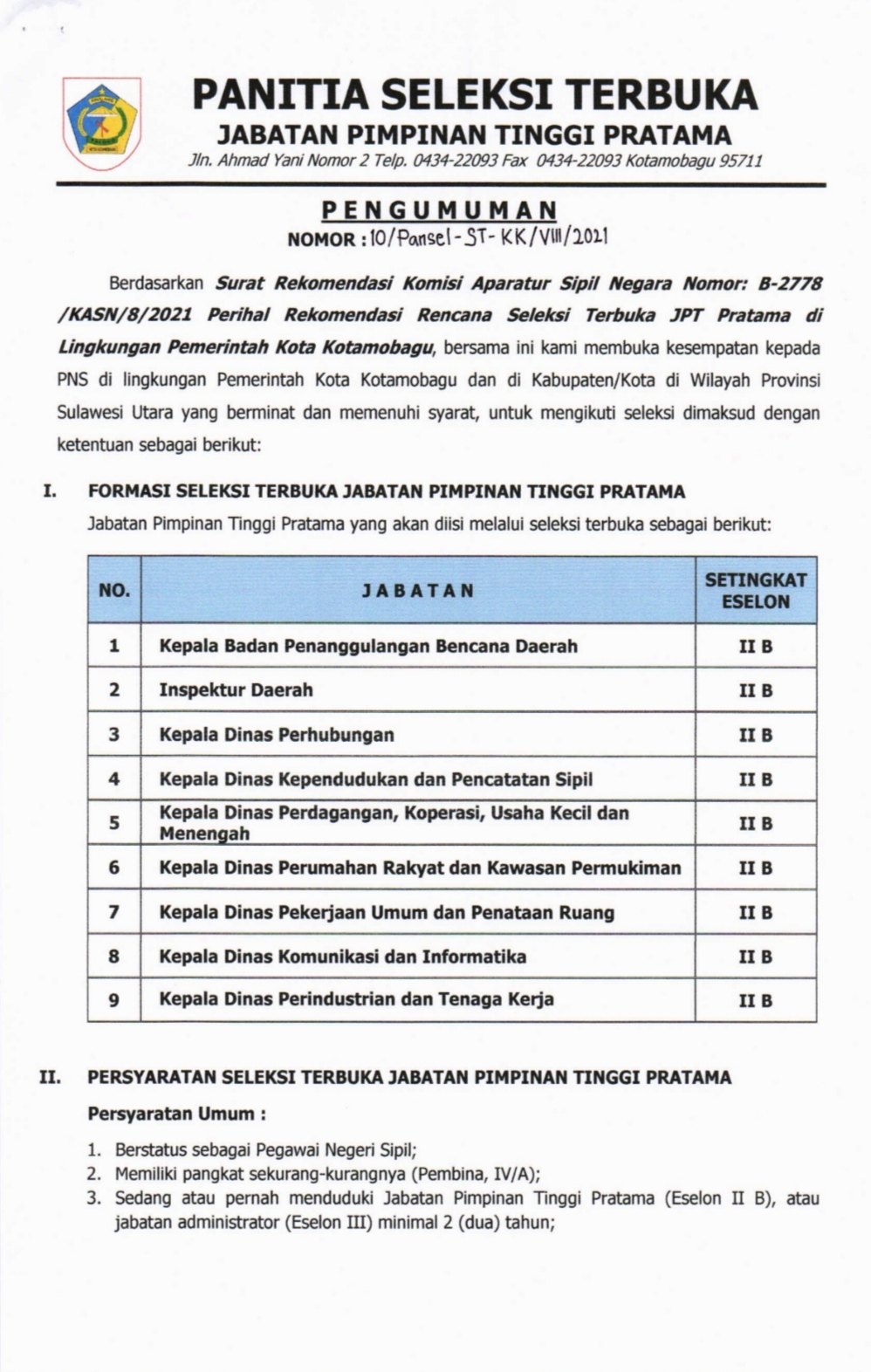Dalam pengumuman tersebut, seleksi JPT Pratama ini, berdasarkan surat rekomendasi Komisi Aparatur Sipil Negara (KASN) nomor: B-2778 /KASN/8/2021, perihal rekomendasi rencana seleksi terbuka JPT Pratama di lingkungan Pemkot Kotamobagu.