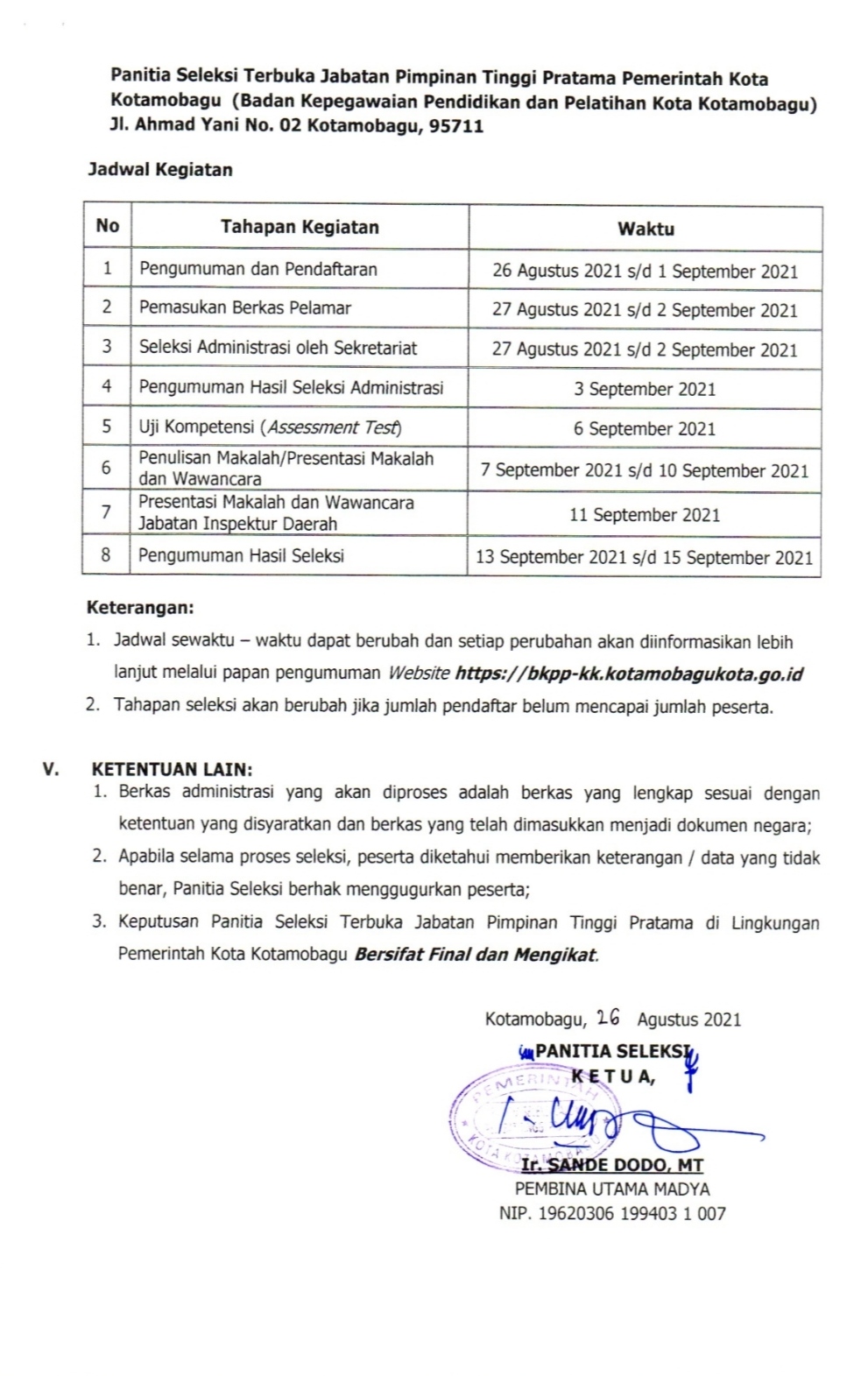 Pengumuman dari Panitia Seleksi (Pansel) bernomor: 10/Pansel-ST-KK/VIII/2021, tertanggal 26 Agustus 2021 ini, ditandatangani Ketua Pansel, Ir Sande Dodo MT, yang juga sebagai Sekretaris Kota (Sekot) Kotamobagu.
