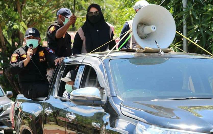 Dalam penyampaiannya menggunakan pengeras suara, Rosita Pobela mengingatkan jika Kabupaten Boltim sebagai zona merah.