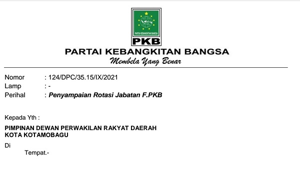 Ini isi surat DPC PKB terkait rotasi di tubuh Fraksi PKB Kotamobagu