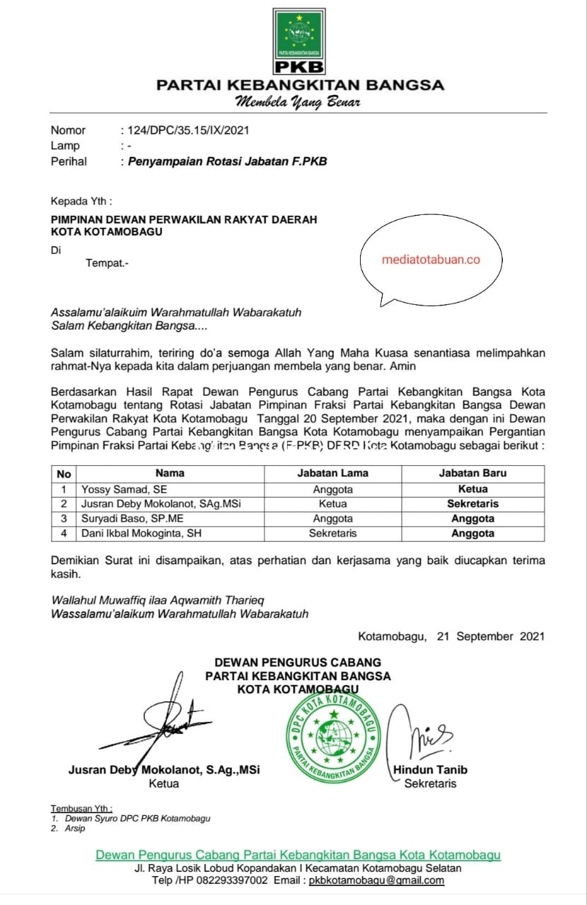 “Ini berdasarkan hasil rapat Dewan Pengurus Cabang Partai Kebangkitan Bangsa Kota Kotamobagu, tentang Rotasi Jabatan Pimpinan Fraksi Partai Kebangkitan Bangsa Dewan Perwakilan Rakyat Kota Kotamobagu, tanggal 20 September 2021,” kata Jusran.