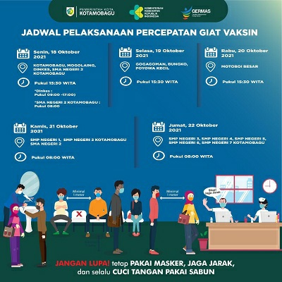 “Pelaksanaan vaksinasi untuk Kelurahan Kotamobagu, dan Kelurahan Mogolaing dibuka pukul 15.30 wita. Untuk SMA Negeri 2 Kotamobagu dibuka pukul 08.00 wita. Sedangkan di Dinkes Kotamobagu dibuka pukul 09.00-1700 wita,” katanya lagi.