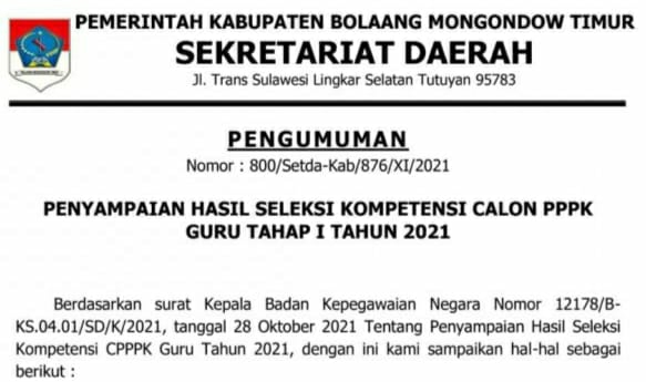 mediatotabuan.co, Boltim – Panitia Seleksi (Pansel) Nasional Pengadaan Calon Aparatur Sipil Negara (CASN) 2021 telah mengumumkan hasil ujian kompetensi PPPK Guru Kabupaten Boltim.Hasil pengumuman tersebut, ditindaklanjuti dengan surat pengumuman Penerimtah Kabupaten Bolaang Mongondow Timur nomor: 800/Setda-Kab/876/XI/2021 tentang Penyampaian Hasil Seleksi Kompetensi Calon PPPK Guru Tahap I Tahun 2021, tertanggal 17 November 2021.