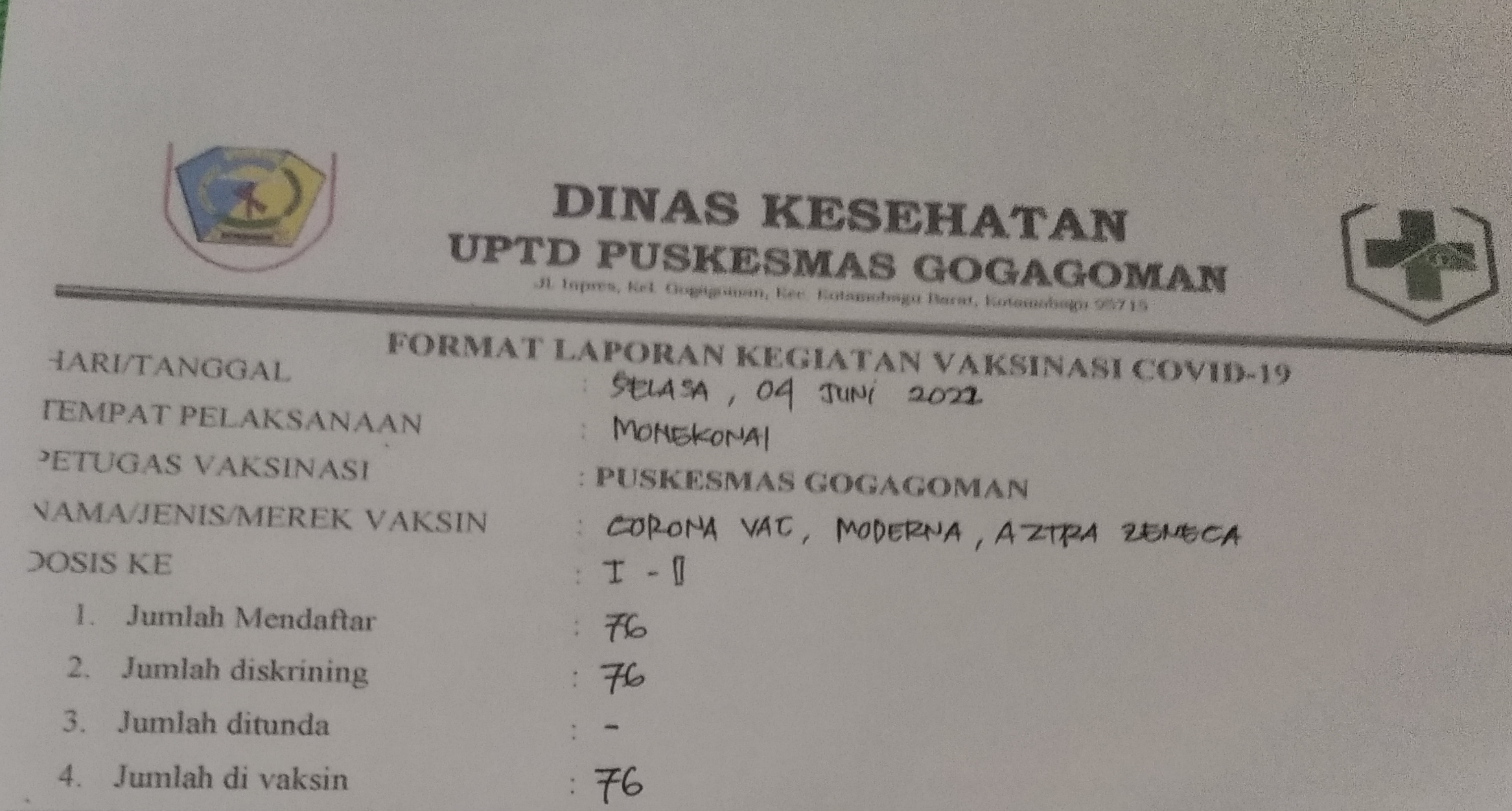 Dalam kegiatan vaksinasi bagi masyarakat umum ini, tim vaksinator dari Puskesmas Gogagoman berhasil menyuntikkan vaksin Covid-19 kepada 76 warga.