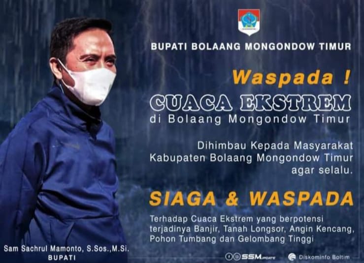 mediatotabuan.co, Boltim – Bupati Kabupaten Bolaang Mongondow Timur (Boltim), Sam Sachrul Mamonto, mengimbau semua masyarakat Boltim untuk siaga dan waspada dengan cuaca ekstrim yang terjadi di Boltim.
