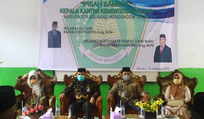 Suasana kekeluargaan nampak pada acara tersebut. Kepala Kantor (Kakan) Kemenag Bolmut yang baru dilantik Idrus Sante S Ag, M Pd, sangat mengapresiasi kinerja Kakan Kemenag lama Basri Saenong S Ag M Pd, yang saat ini telah menjadi Kepala Bagian Tata Usaha (TU) Kantor Wilayah Kemenag Provinsi Sulawesi Utara.