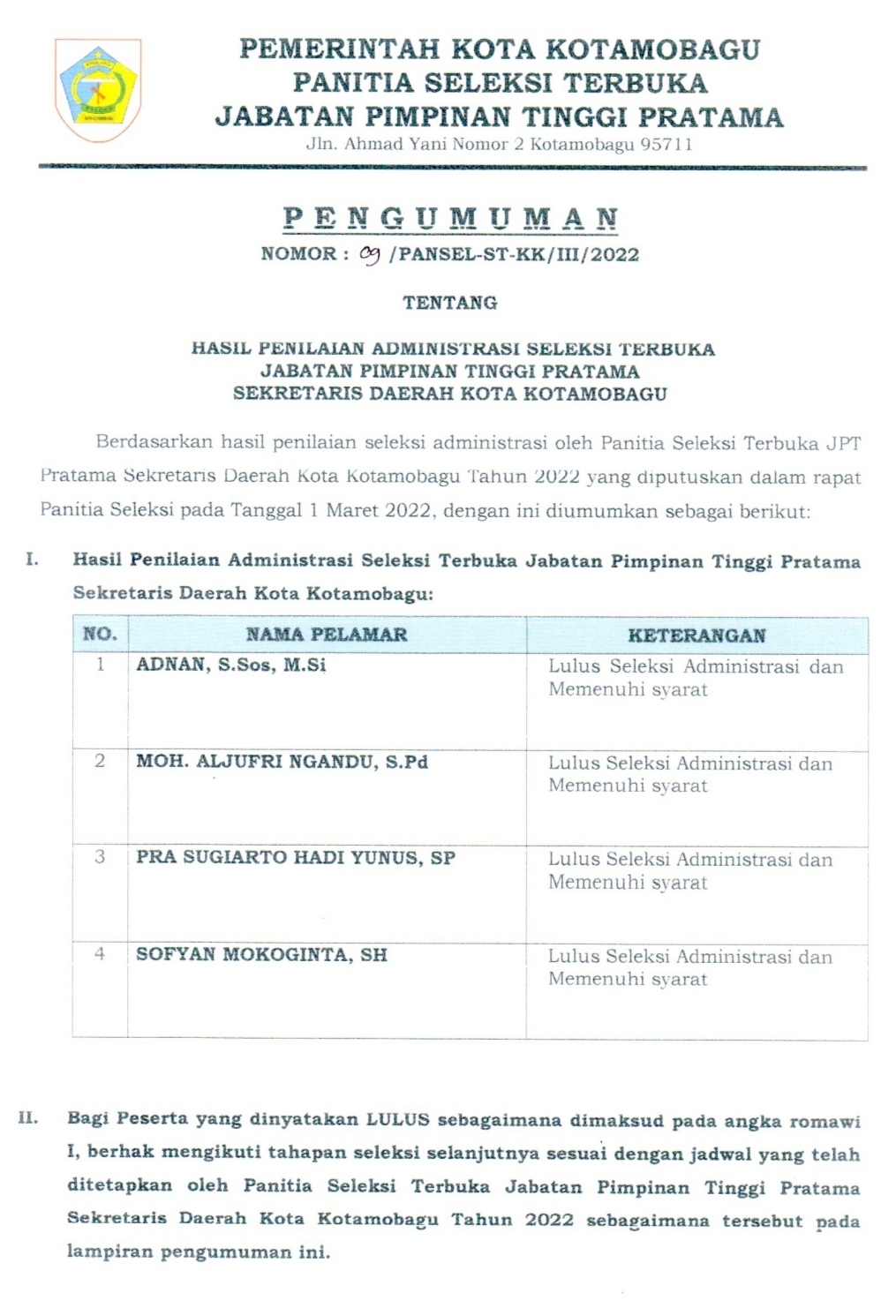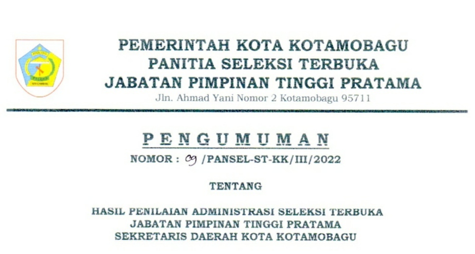 mediatotabuan.co, Kotamobagu – Pemerintah Kota (Pemkot) Kotamobagu, melalui Panitia Seleksi (Pansel) Jabatan Pimpinan Tinggi Pratama untuk jabatan calon Sekretaris Daerah (Sekda) Kotamobagu, saat ini membuka pendaftaran calon “Panglima” ASN Kotamobagu.