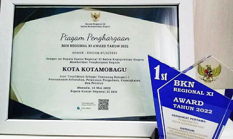 Penghargaan yang diraih Pemkot Kotamobagu melalui Badan Kepegawaian, pendidikan dan Pelatihan (BKPP) ini, atas Perencanaan Kebutuhan, Pelayanan Pengadaan, Kepangkatan dan Pensiun.