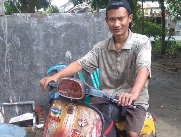 Jhon alias Ariyanto saat bersiap perjalanan kembali ke Sumatera Utara, dengan motor Vespa miliknya, Sabtu (21/05). (foto: Fahmi Gobel)