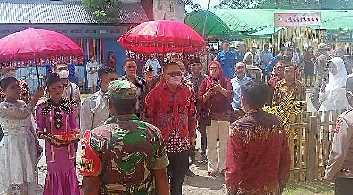 Ketua Sinode Gereja Masehi Injil di Bolaang Mongondow (GMIBM), Pendeta Fecky W Kamasaan MTh, memberikan apresiasi kepada Pj Bupati Bolmong, Hi Limi Mokodompit, Ketua DPRD Bolmong Welty Komaling, dan rombongan atas kehadirannya di peresmian Gereja Eben Haezer Labuan Uki.