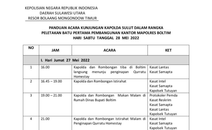 mediatotabuan.co, Boltim — Kapolda Sulawesi Utara, agendakan kunjungan ke Kabupaten Bolaang Mongondow Timur (Boltim) besok (Sabtu). Saat ini rundown (susunan) kegiatan sudah diserahkan sebagai dasar kegiatan.