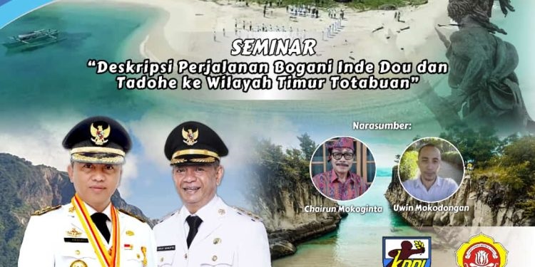 Seminar dengan tema ‘Deskripsi Perjalanan Bogani Inde Dou dan Tadohe ke Wilayah Timur’ ini akan dilangsungkan pada Kamis, 7 Juli 2022, pukul 9.30 Wita, bertempat di Aula Lantai III Kantor Bupati Boltim, dengan menghadirkan Chairun Mokoginta dan Uwin Mokodongan sebagai Narasumber.