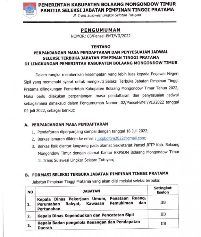 Dalam surat dengan nomor: 03/Pansel-BMT/VII/2022, tentang perpanjangan masa pendaftaran dan penyesuaian jadwal seleksi terbuka Jabatan Pimpinan Tinggi Pratama di lingkungan Pemkab Boltim yang tertulis, masa pendaftaran diperpanjang sampai dengan tanggal 18 Juli 2022.