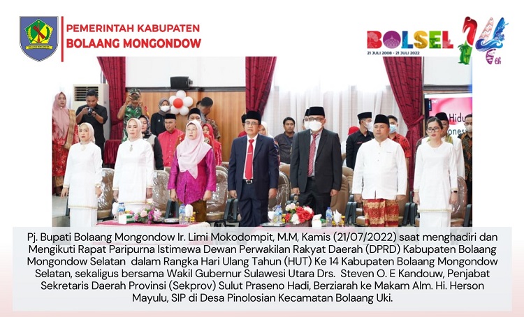 Pj Bupati Bolmong, Ir Limi Mokodompit MM, menghadiri rangkaian agenda HUT Kabupaten Bolsel yang dipimpin Bupati Iskandar Kamaru dan Wakil Bupati Deddy Abdul Hamid.