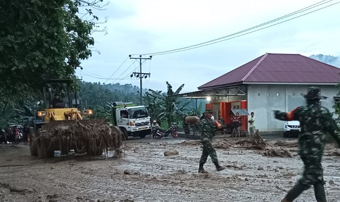 Suasana pembersihan jalan AKD Desa Inuai dari material longsor, Senin (17/10/2022). (Foto: Dok Koramil Passi)