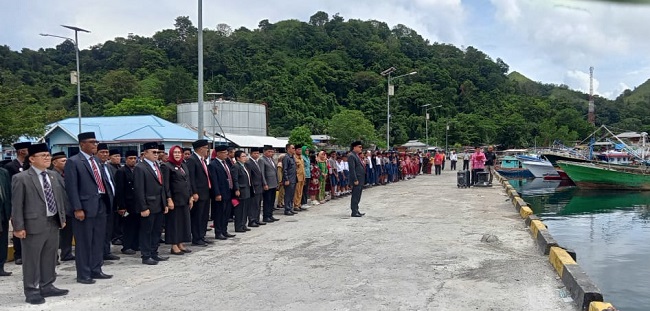 Usai pelaksanaan upacara Pj Bupati bersama Forkompimda dan jajarannya turut melakukan prosesi pelarungan bunga di pelabuhan laut Desa Labuan Uki, guna untuk menghormati jasa para pahlawan. (Foto: Atek Mokoginta)