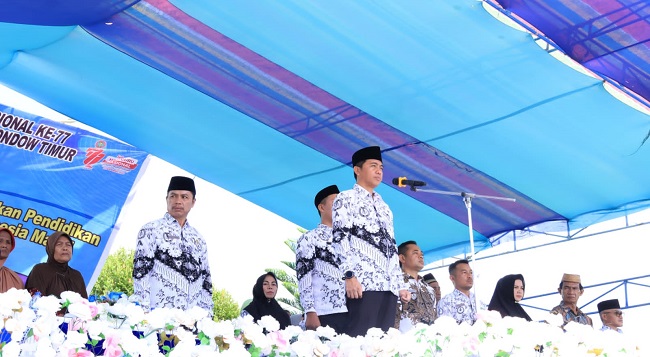 mediatotabuan.co, Boltim – Bupati Bolaang Mongondow Timur (Boltim) Sam Sachrul Mamonto memimpin langsung pelaksanaan Upacara dalam rangka Peringatan Hari Guru Nasional (HGN) dan Hari Ulang Tahun (HUT) ke-77 Persatuan Guru Republik Indonesia (PGRI) yang dilangsungkan di Lapangan depan kantor bupati Boltim, Jum’at (25/11/2022).