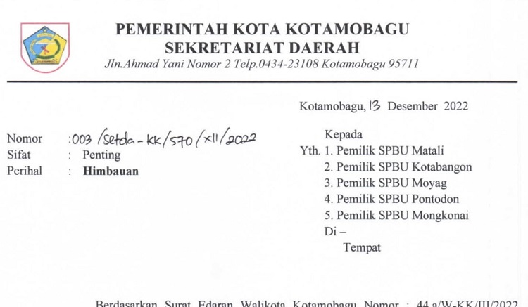 mediatotabuan.co, Kotamobagu – Pemerintah Kota (Pemkot) Kotamobagu, menerbitkan surat imbauan Bernomor 003/Setda-KK/570/XII/2022 terkait penyaluran Jenis BBM Tertentu (JBT) Solar Bersubsidi. Surat ini ditujukan kepada Pengelola Stasiun Pengisian Bahan Bakar Umum (SPBU) di wilayah Kota Kotamobagu.